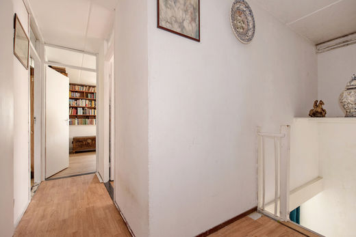 Verdieping: ruime overloop, hoofdslaapkamer 4.25x3.16 aan achterzijde met aan twee zijden ramen, tweede slaapkamer 4.76x2.87 eveneens aan de achterzijde ingericht als werkruimte, voorkamer 3.37x2.52, vierde grote slaapkamer 5.99x3.03 voorzien van een keukenblok en een vaste kast met een opstelplaats voor een cv-ketel (Remeha Avanta HR uit 2012). Tussenliggende geheel betegelde badkamer voorzien van een ligbad, een grote douchegelegenheid, wastafel en toilet. Door het platte goed geïsoleerde dak geen ruimteverlies op deze verdieping.